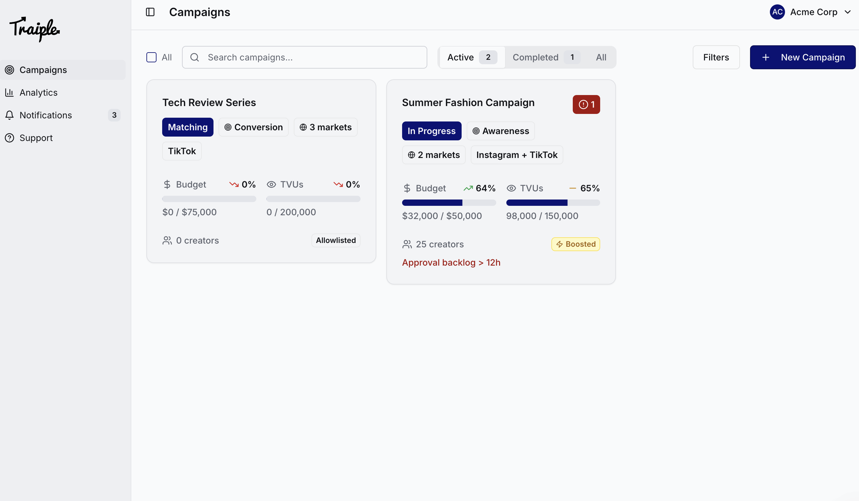 Traiple turns creator chaos into ads-like clarity ā standardized campaigns, ROI tracking, and seamless payments.
